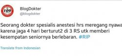 "Seorang dokter spesialis anestesi hrs meregang nyawa karena jaga 4 hari berturut2 di 3 RS utk memberi kesempatan seniornya berlebaran. #RIP," bunyi keterangan dalam unggahan tersebut.